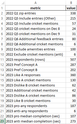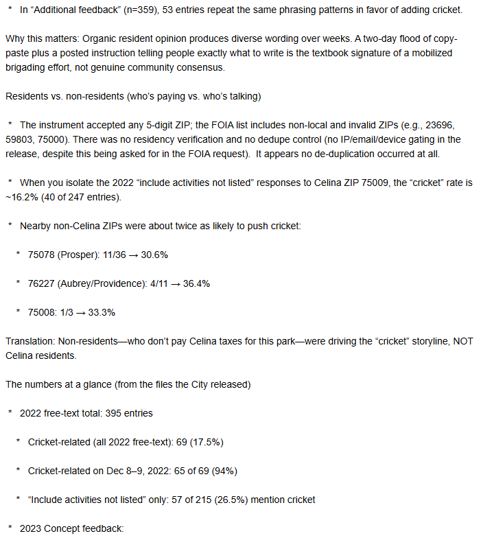 Voting on the 2023 survey was astroturfed, with a sudden influx of voters supporting cricket pitches when residents had previously been vocally opposed to building them. The city cannot provide evidence that the pro-cricket votes came from Celina residents.