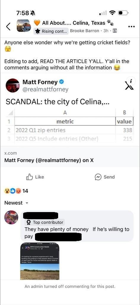 A large number of the pro-cricket comments posted followed a script. There was even a comment telling cricket supporters what, exactly, to post. This suggests interference from Indians outside of Celina.