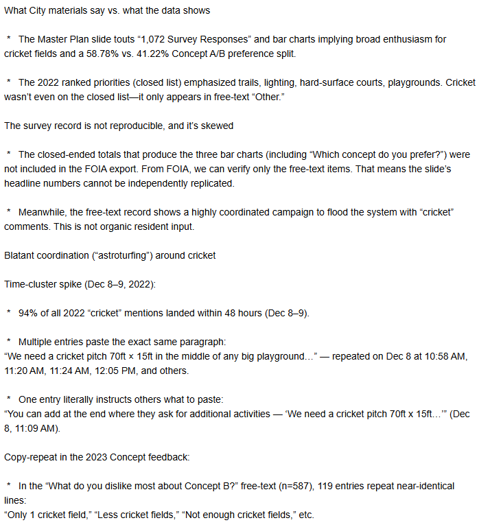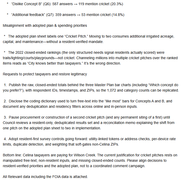 In short, it appears that Indians gamed the Celina survey to make it appear that residents supported installing cricket pitches despite their vocal opposition. Millions of taxpayer dollars are now going to be wasted on a municipal project only a handful of Indians want. The resident has reached out to Texas Attorney General Ken Paxton to investigate the Wilson Creek Park project as the city has dismissed his concerns.